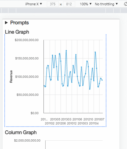 Practically speaking there are a few actions to take when consuming the reports on a mobile device. For one the reports are sitting inside an iframe that is actually set with a minimum width that is wider than most mobile device screens. Secondly, the application bar at the top is far wider than would be supported.