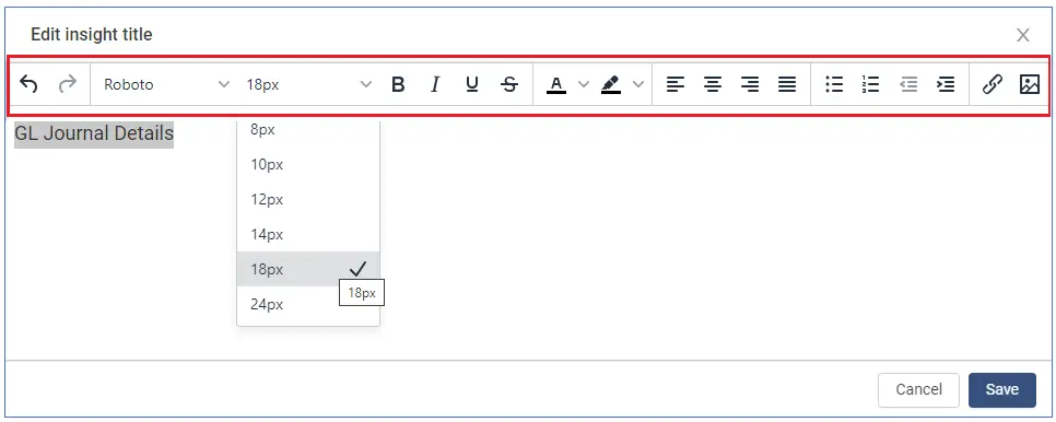 Type the name of the Insight and highlight the name to change the font size, the position, and other font parameters as needed. Click Save to save the title change.
