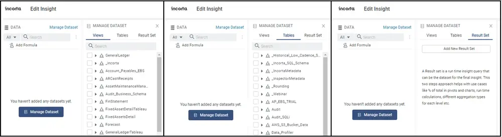 Click on Views, Tables or Result Set to begin selecting data for your Insight. You may choose a combination of Views, Tables or Result Set depending on the requirements of your Insight.